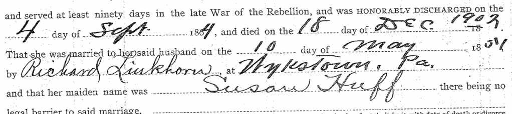 Susan Huff married Richard Tea on May 10, 1852. We did not know this date or the general location until I ordered Richard’s Civil War records and the pension records. In another spot in the pension it states they were married May 10, 1851 by Richard Linkhorn at Wykstown, PA. The issue with this information is there are no records of a Richard Linkhorn in newspapers or in census records. And to add to the issue, there is no place called Wykstown.