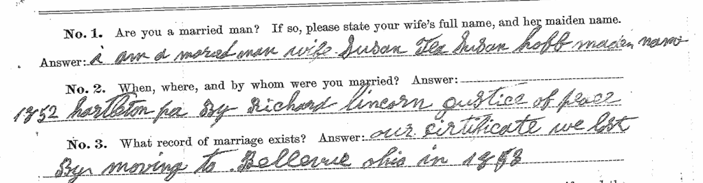 Another section notes they were married in 1852 in Hartleton, PA by justice of the peace, Richard Lincorn. Hartleton is a borough in Union County, PA. This county coincides with the Joseph Huff that is believed to be Susan’s father. On this record it is noted that the family moved to Ohio in 1853 and in the move they lost the marriage record.